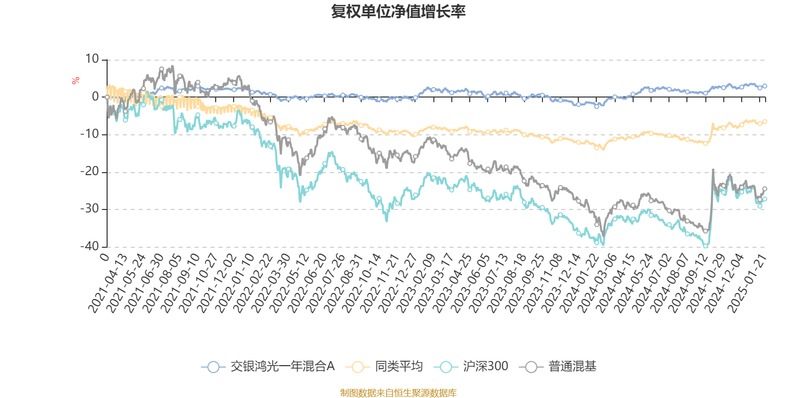 截至1月21日,交银鸿光一年混合A近三个月复权单位净值增长率为0.15%,位于同类可比基金559/670;近半年复权单位净值增长率为1.00%,位于同类可比基金602/670;近一年复权单位净值增长率为5.21%,位于同类可比基金456/664;近三年复权单位净值增长率为1.39%,位于同类可比基金302/525。